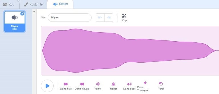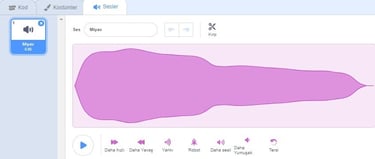 Karakter için var olan sesleri görebilmek için bu bölüme tıklarız. Bu bölümden yeni sesler ekleyebilir (sırasıyla kütüphaneden ses ekler, ses kaydeder, bilgisayarda kayıtlı bir sesi ekler), var olan sesi dinleyebilir, düzenle ve etkiler altındaki komutlarla düzenleyebilirsiniz.