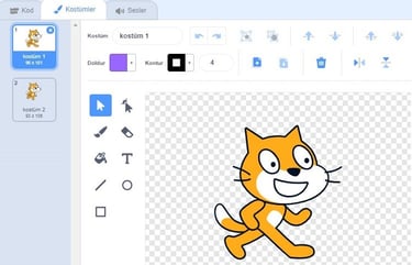 Kuklamızın başka görünümlerinin olmasını istiyorsak kütüphaneden ekleyebilir, kendimiz çizebilir, bilgisayarımızda kayıtlı bir resmi içe aktarabiliriz ya da kamera ile çeke- biliriz. Var olan kostümleri kostümün sağ üst köşesindeki ‘x’ butonuna basarak silebiliriz, seçili kostümü sağdaki düzenleme alanında düzenleyebiliriz. Kostüm üzerinde sağ tık yaparak kopyalayabilir ve silebiliriz.